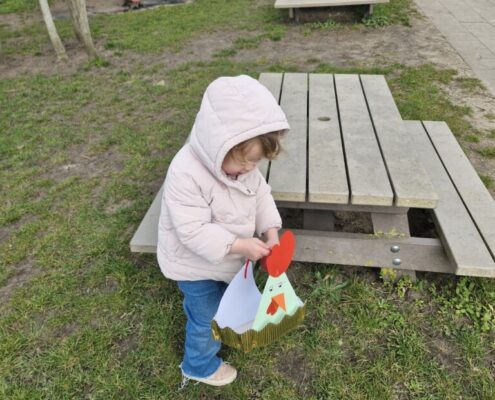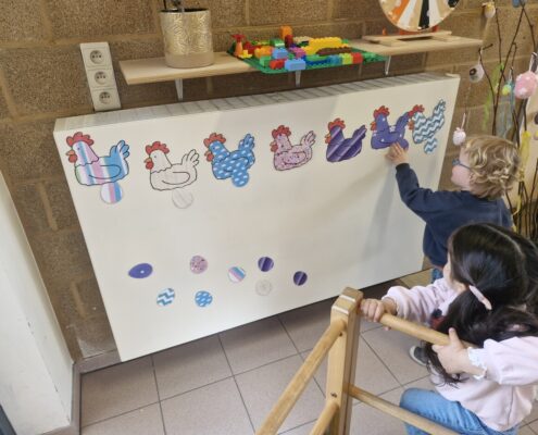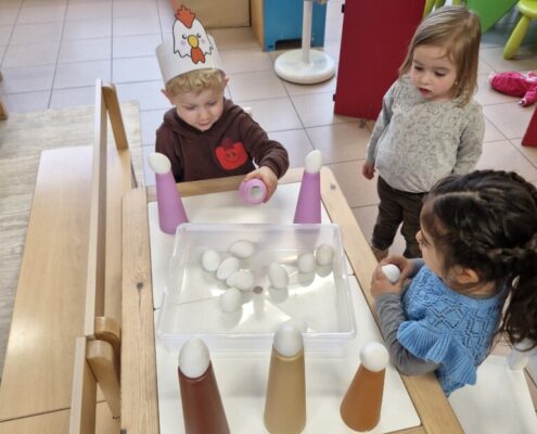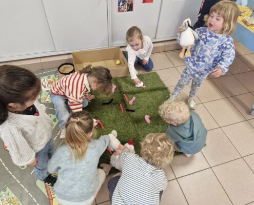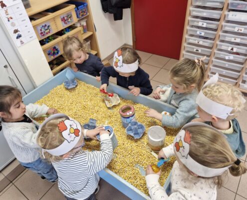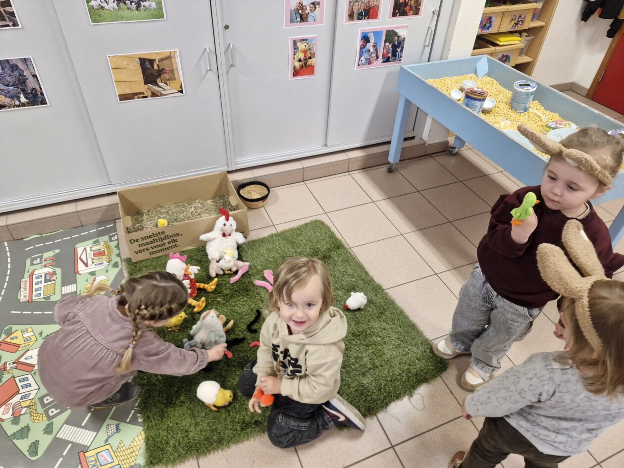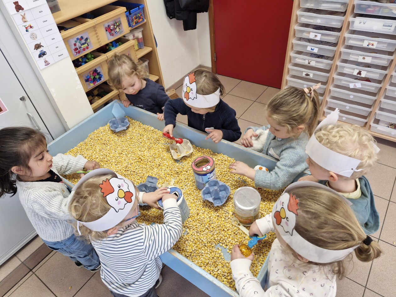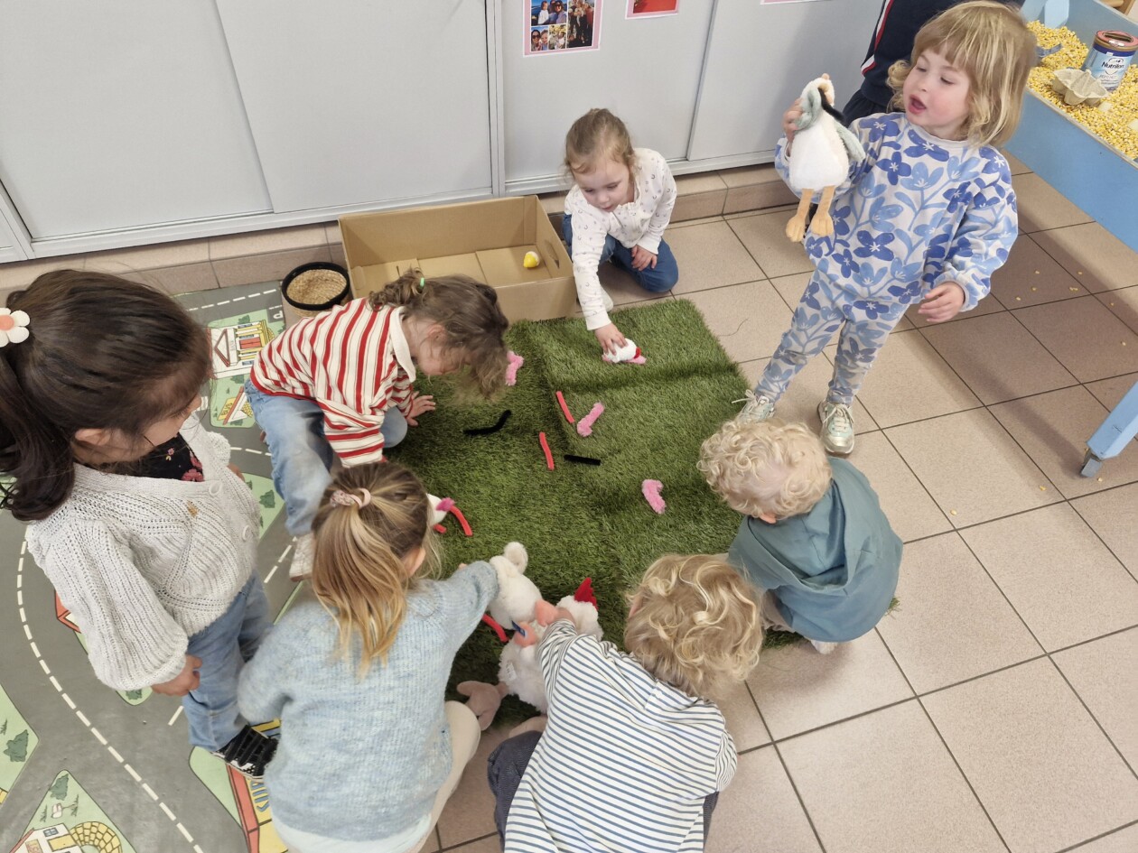 In de klas konden we naar hartenlust spelen met kippenhokjes, (vorm)eieren, de ontdekbak met maïs en nog zoveel meer. In de huishoek konden we zelf kip spelen en in ons kippenhok konden we zorgen voor onze eigen kippen. We gaven ze stro, ze konden lekkere wormen zoeken in het gras en uiteindelijk legden ze ook eitjes!