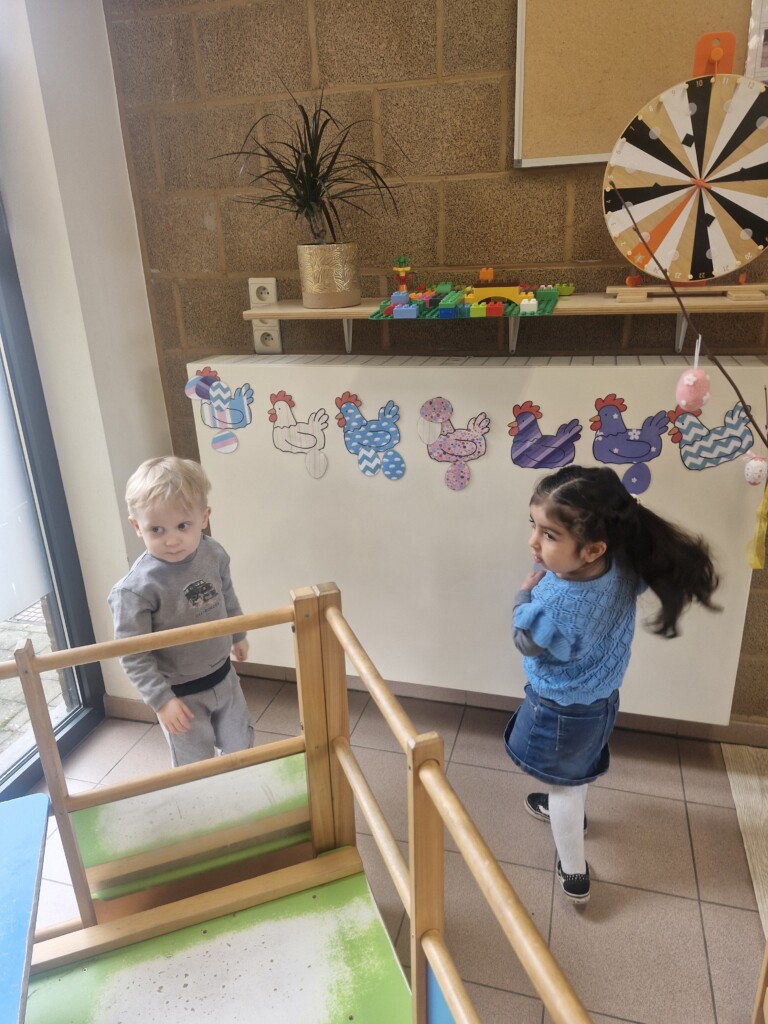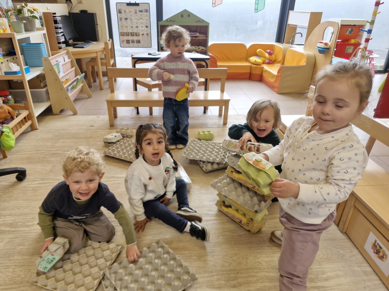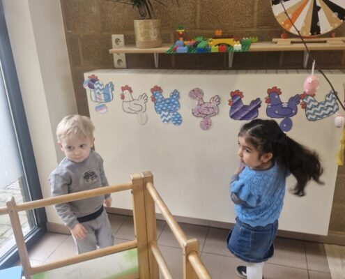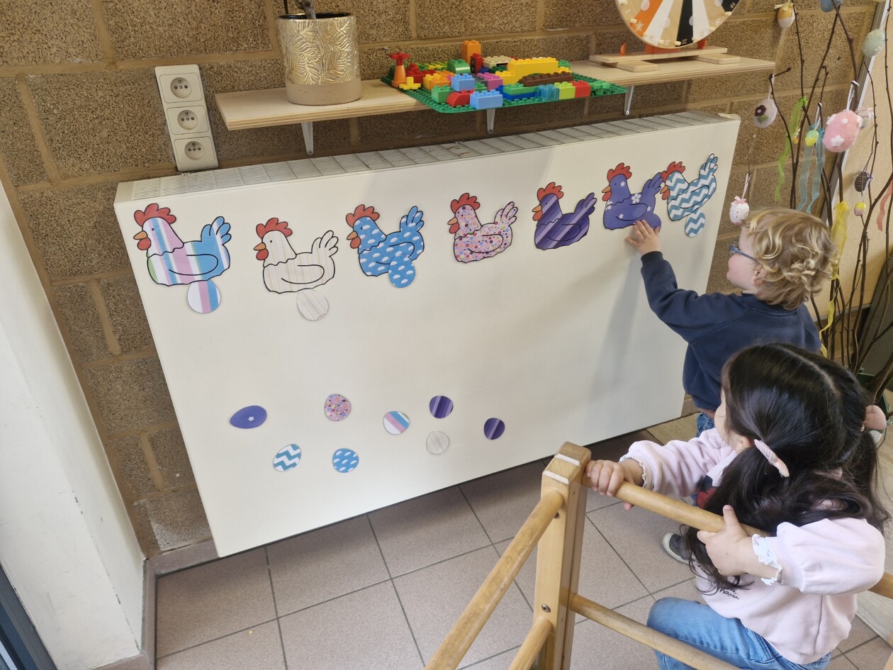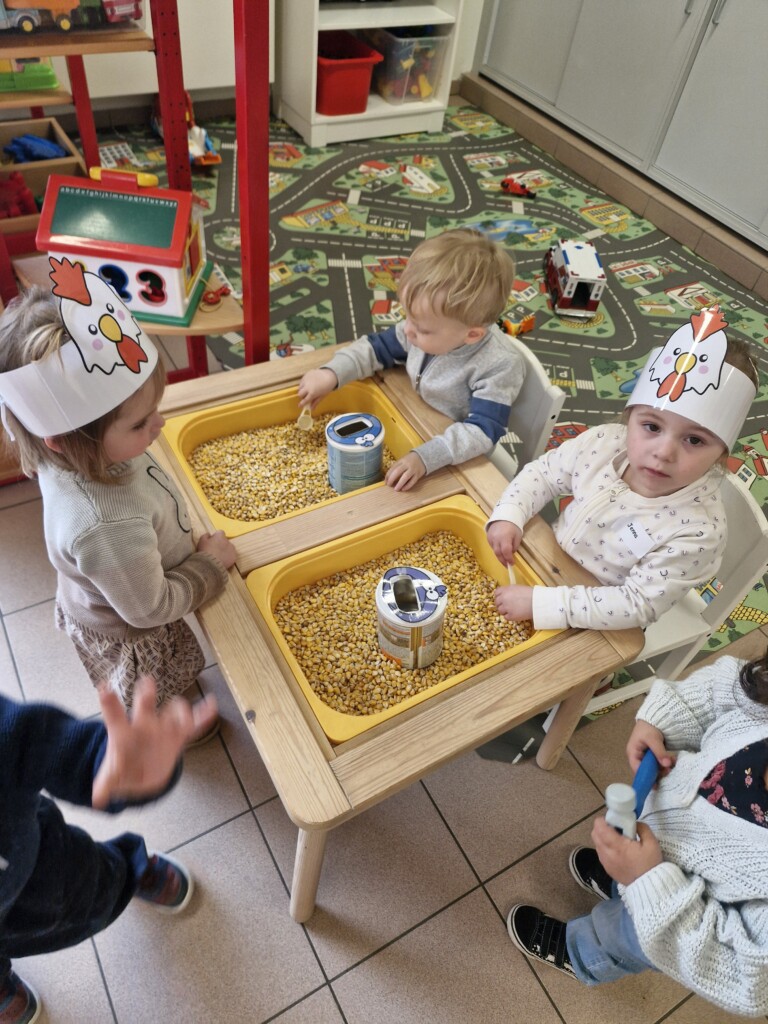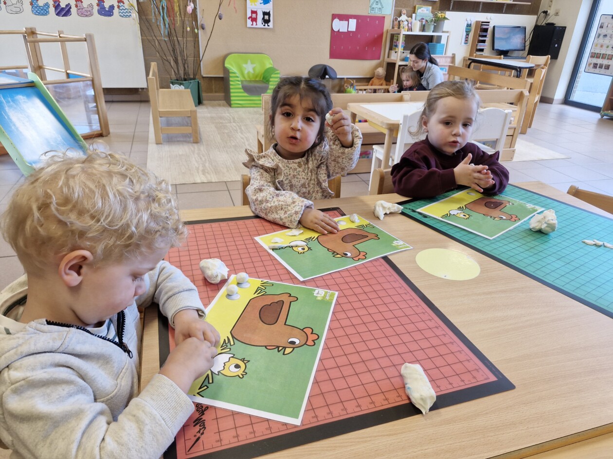 In de klas konden we naar hartenlust spelen met kippenhokjes, (vorm)eieren, de ontdekbak met maïs en nog zoveel meer. In de huishoek konden we zelf kip spelen en in ons kippenhok konden we zorgen voor onze eigen kippen. We gaven ze stro, ze konden lekkere wormen zoeken in het gras en uiteindelijk legden ze ook eitjes!