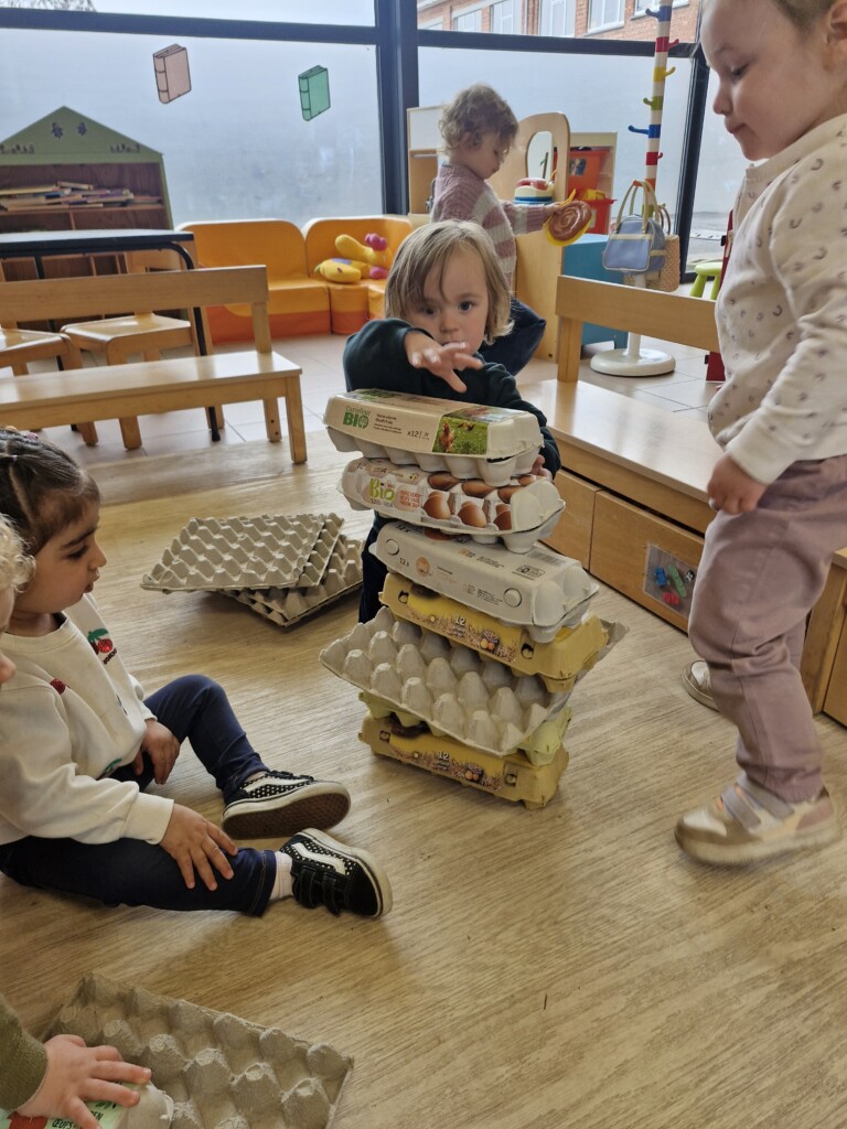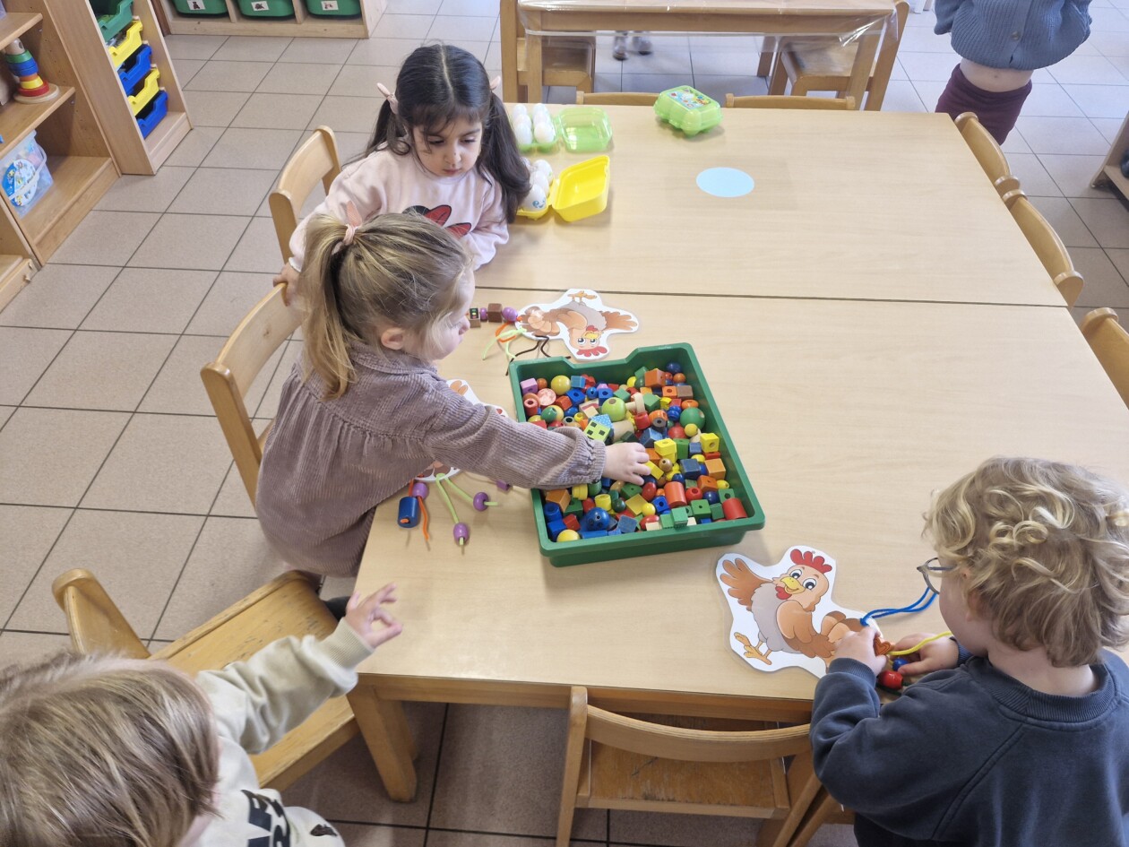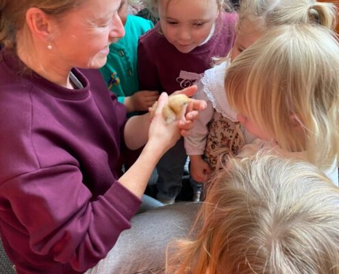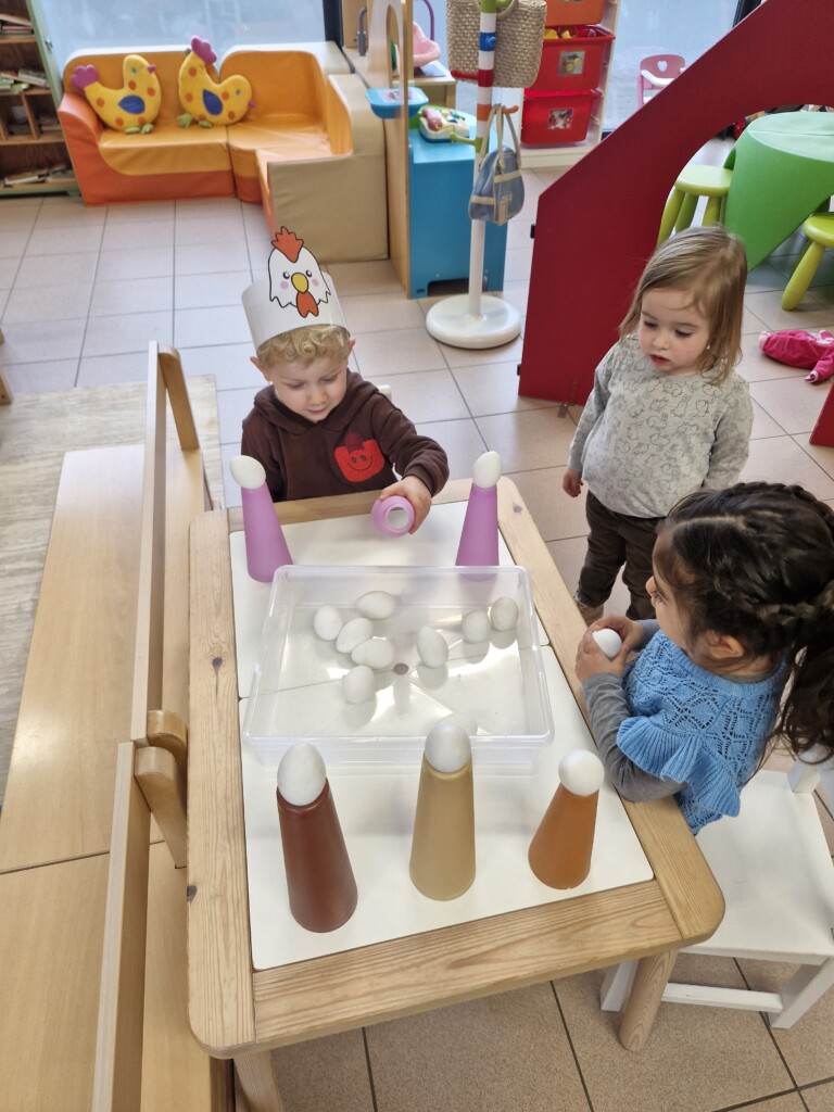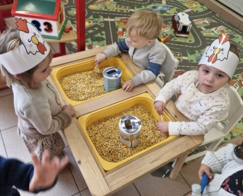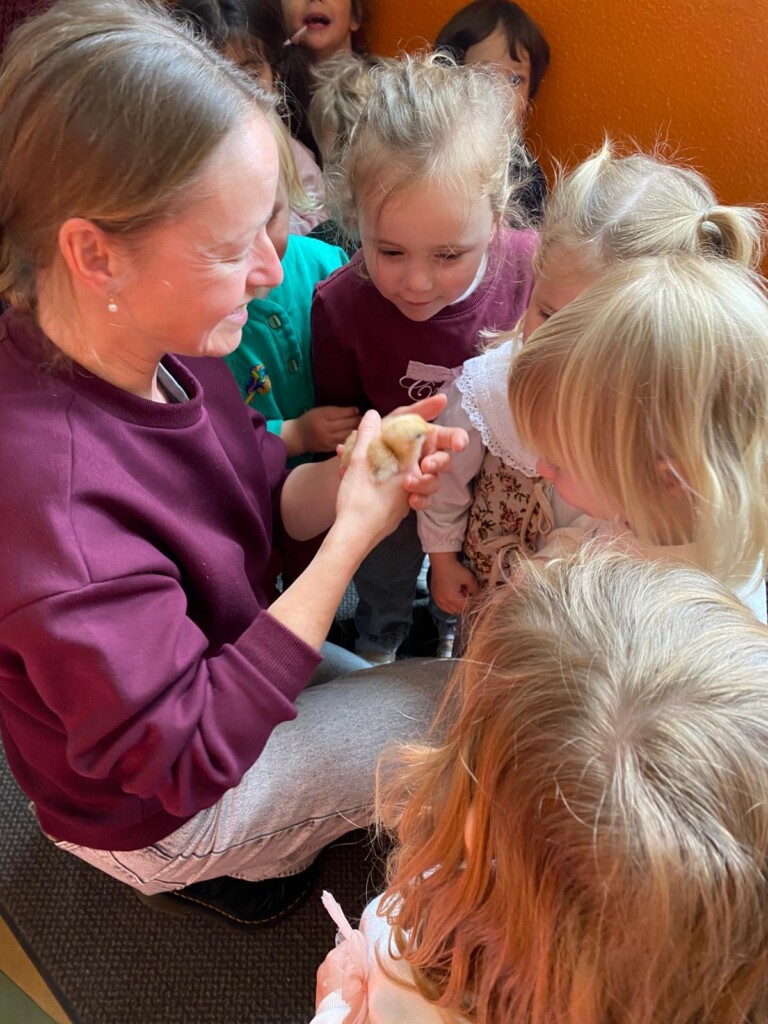 In de klas konden we naar hartenlust spelen met kippenhokjes, (vorm)eieren, de ontdekbak met maïs en nog zoveel meer. In de huishoek konden we zelf kip spelen en in ons kippenhok konden we zorgen voor onze eigen kippen. We gaven ze stro, ze konden lekkere wormen zoeken in het gras en uiteindelijk legden ze ook eitjes!