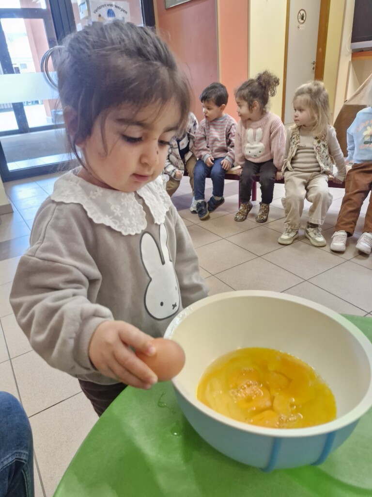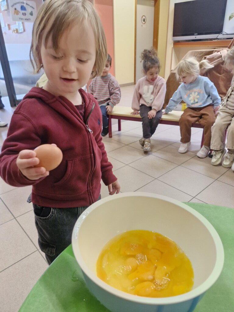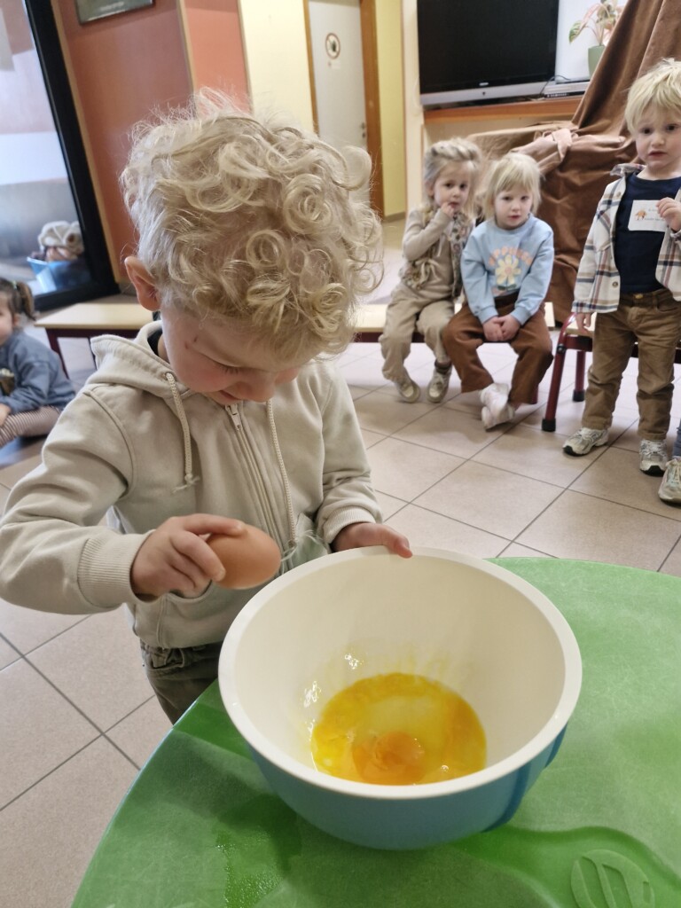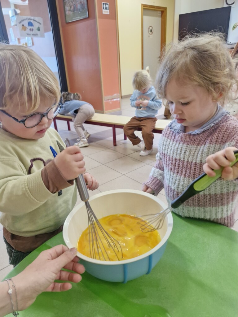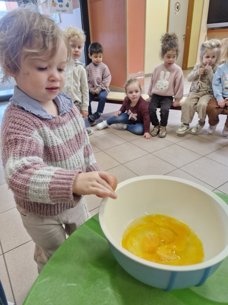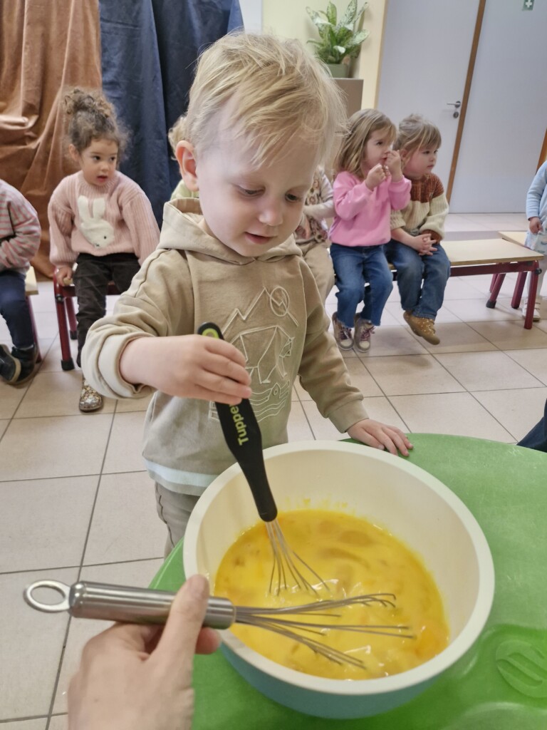 Samen met 1PA maakten we lekkere eitjes klaar. We mochten zelf een eitje breken en dan roeren in de grote pot. De eitjes moesten dan natuurlijk op het vuur en daar moesten we goed opletten, maar de juffen hielpen ons goed. Daarna was het smullen geblazen!