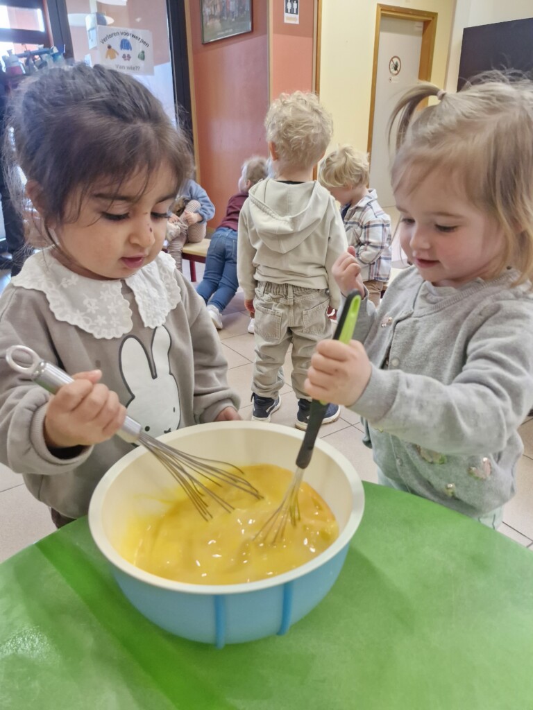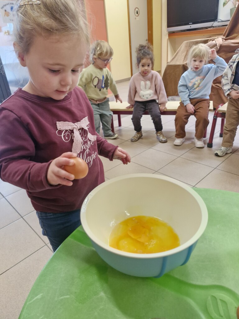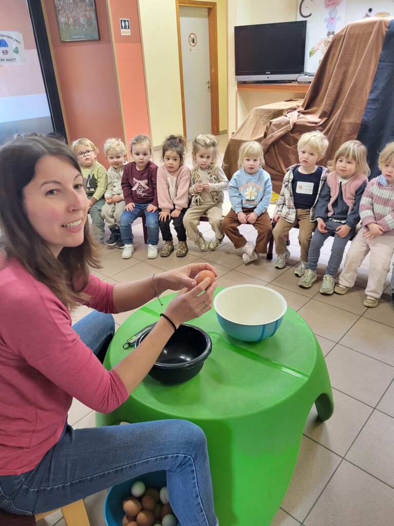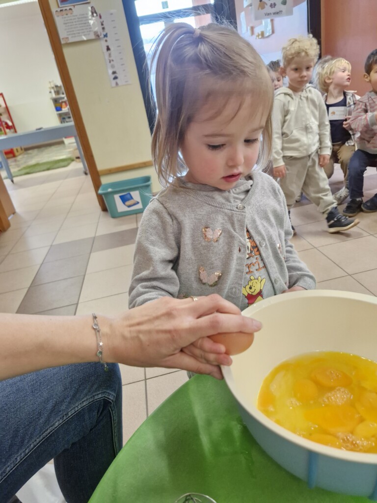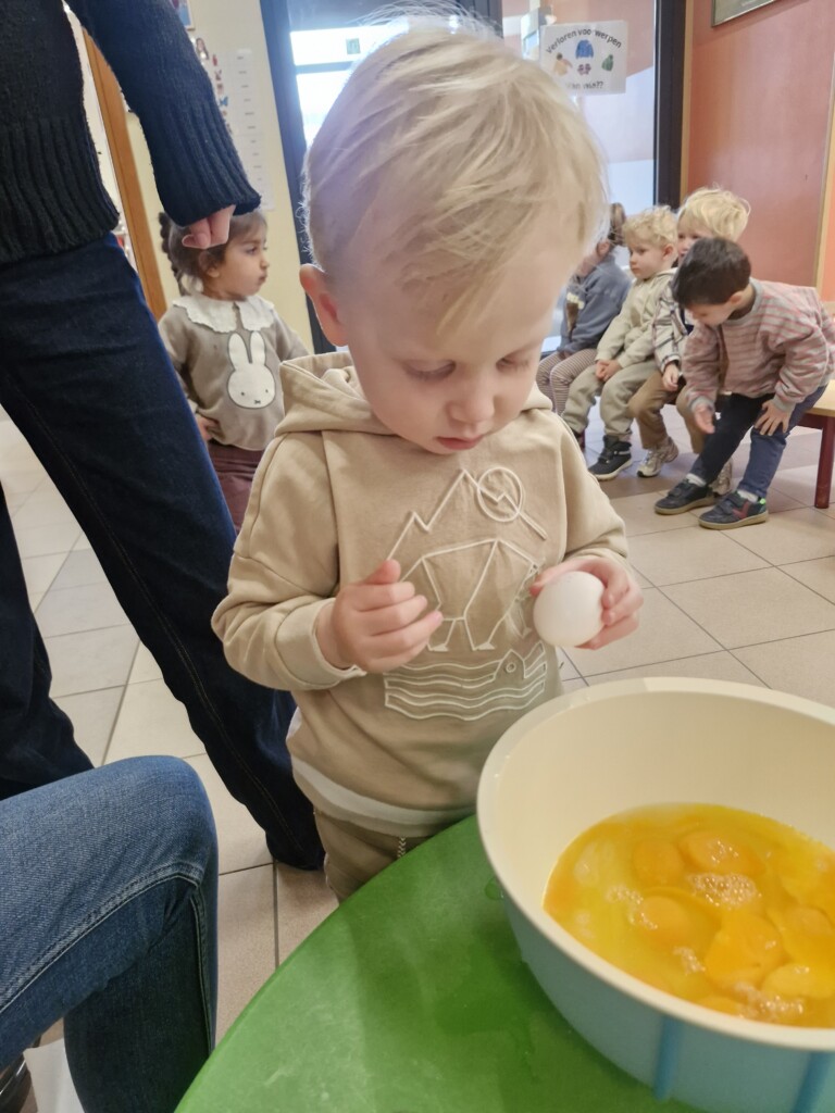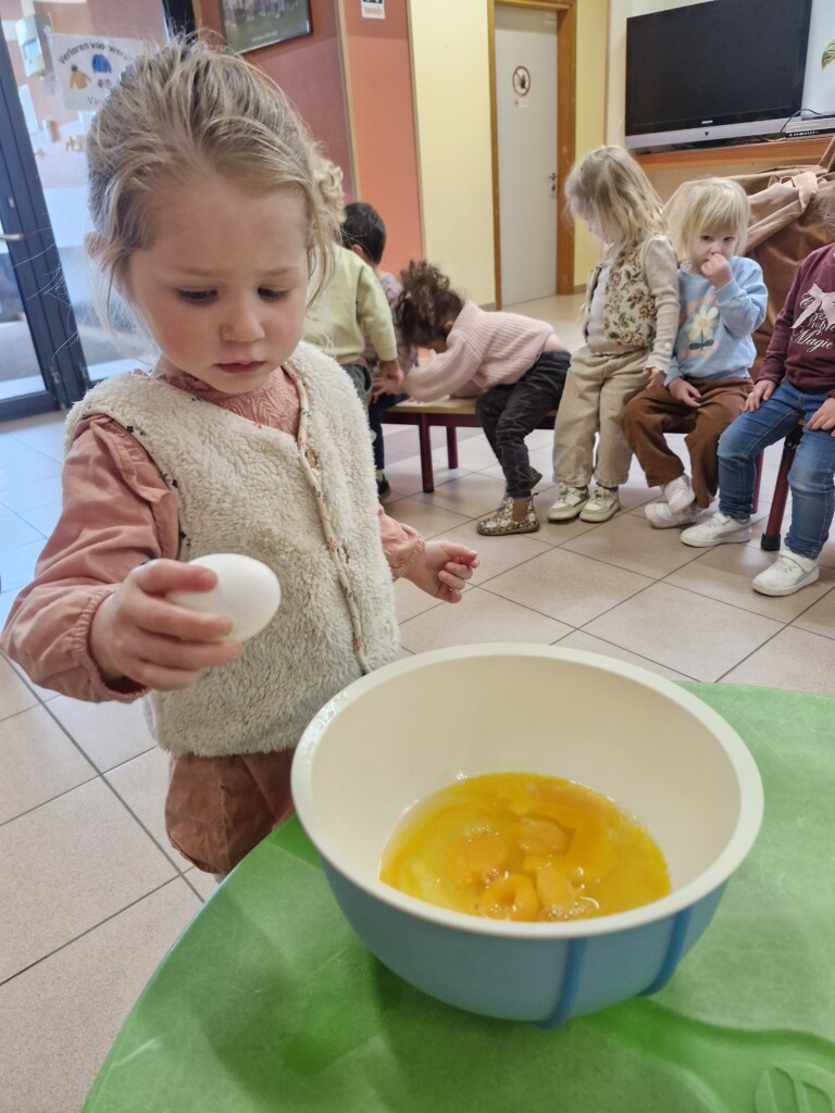 Samen met 1PA maakten we lekkere eitjes klaar. We mochten zelf een eitje breken en dan roeren in de grote pot. De eitjes moesten dan natuurlijk op het vuur en daar moesten we goed opletten, maar de juffen hielpen ons goed. Daarna was het smullen geblazen!