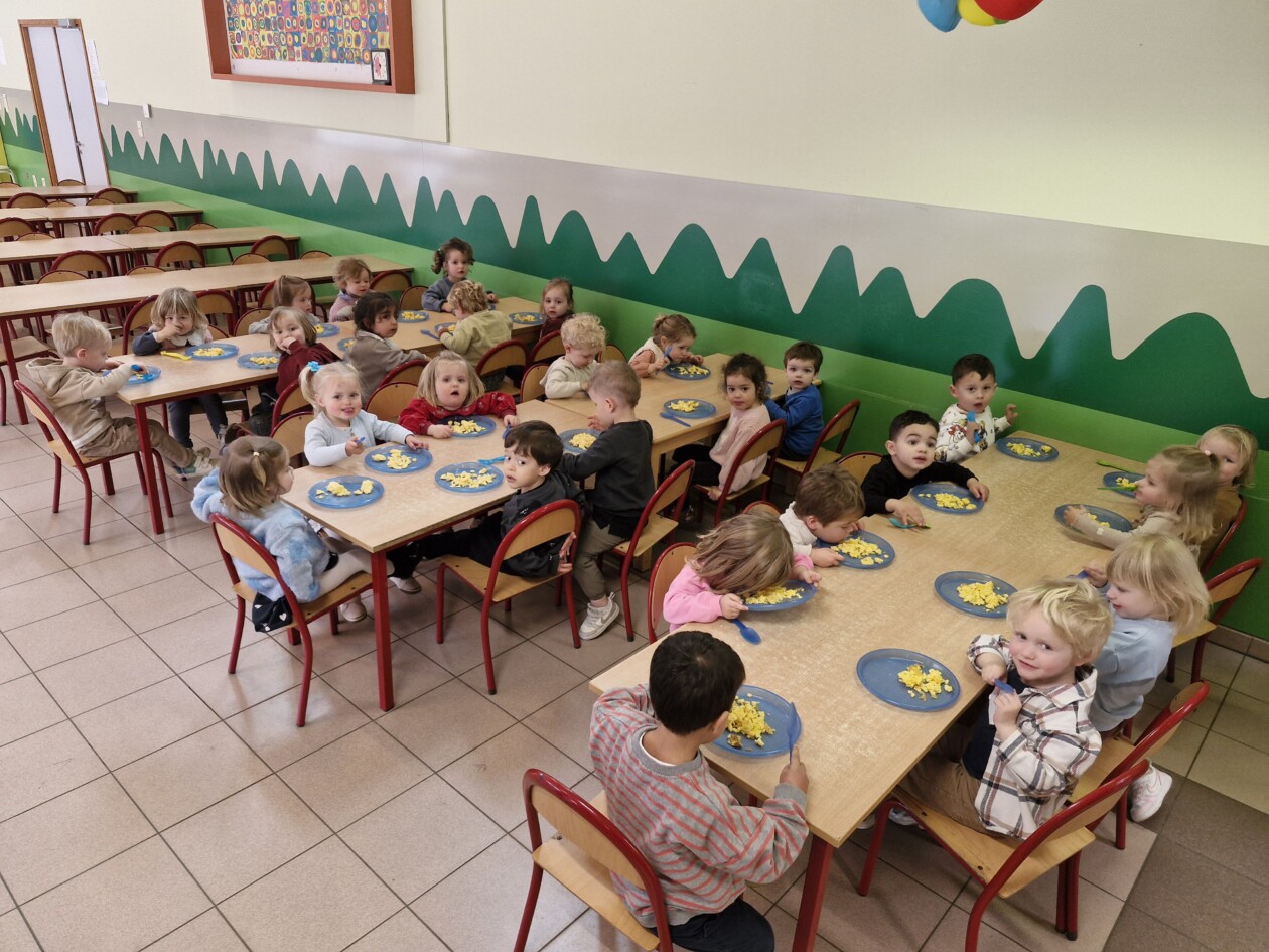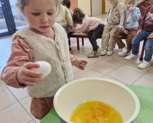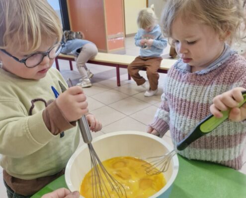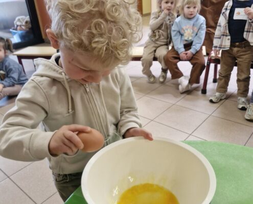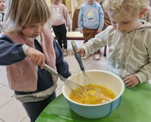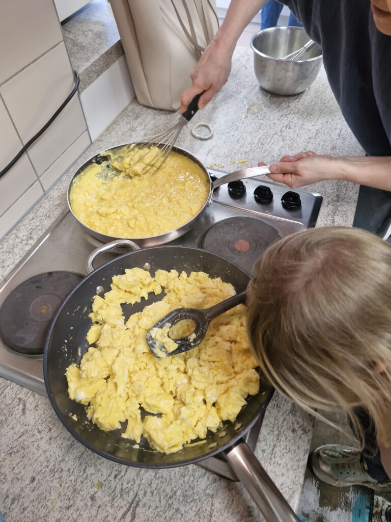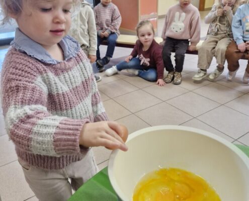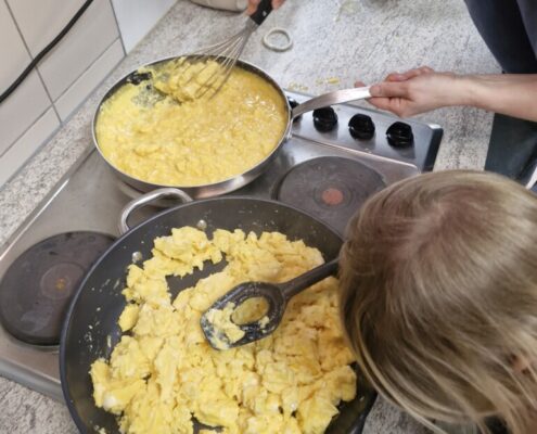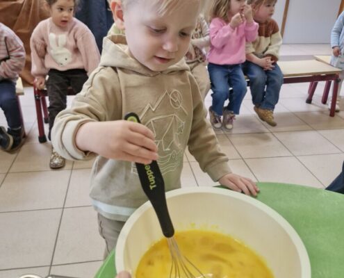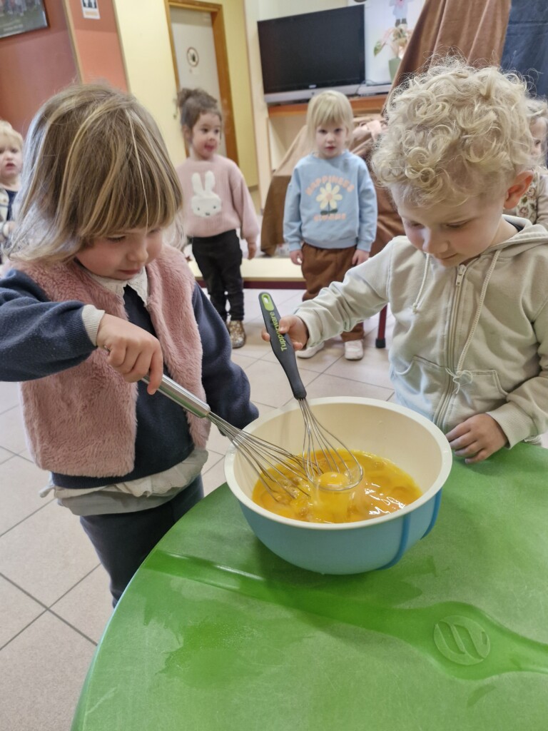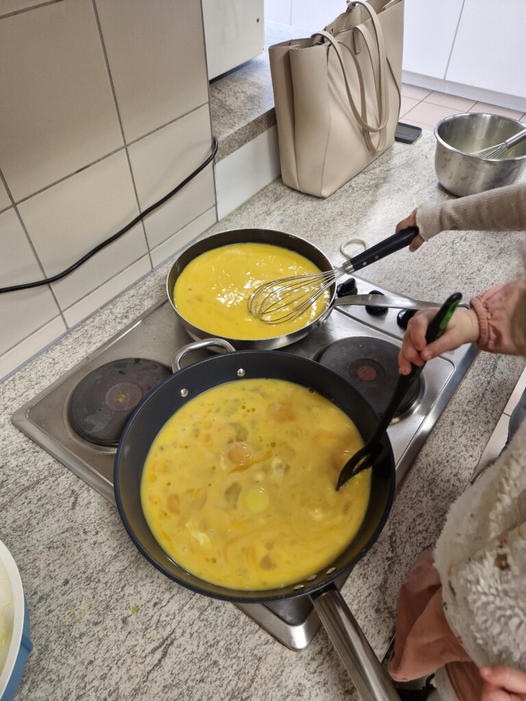 Samen met 1PA maakten we lekkere eitjes klaar. We mochten zelf een eitje breken en dan roeren in de grote pot. De eitjes moesten dan natuurlijk op het vuur en daar moesten we goed opletten, maar de juffen hielpen ons goed. Daarna was het smullen geblazen!