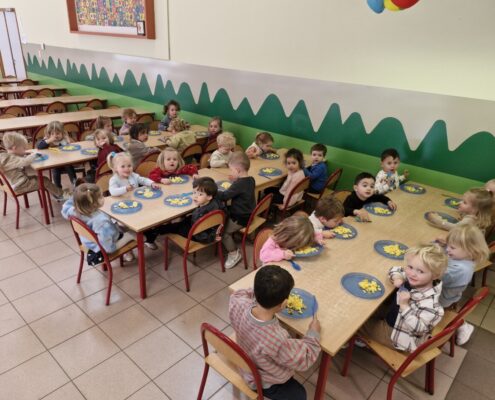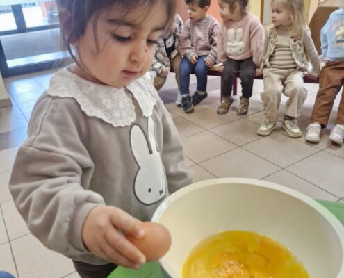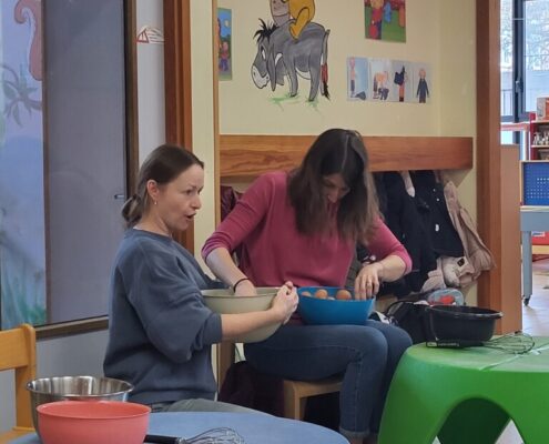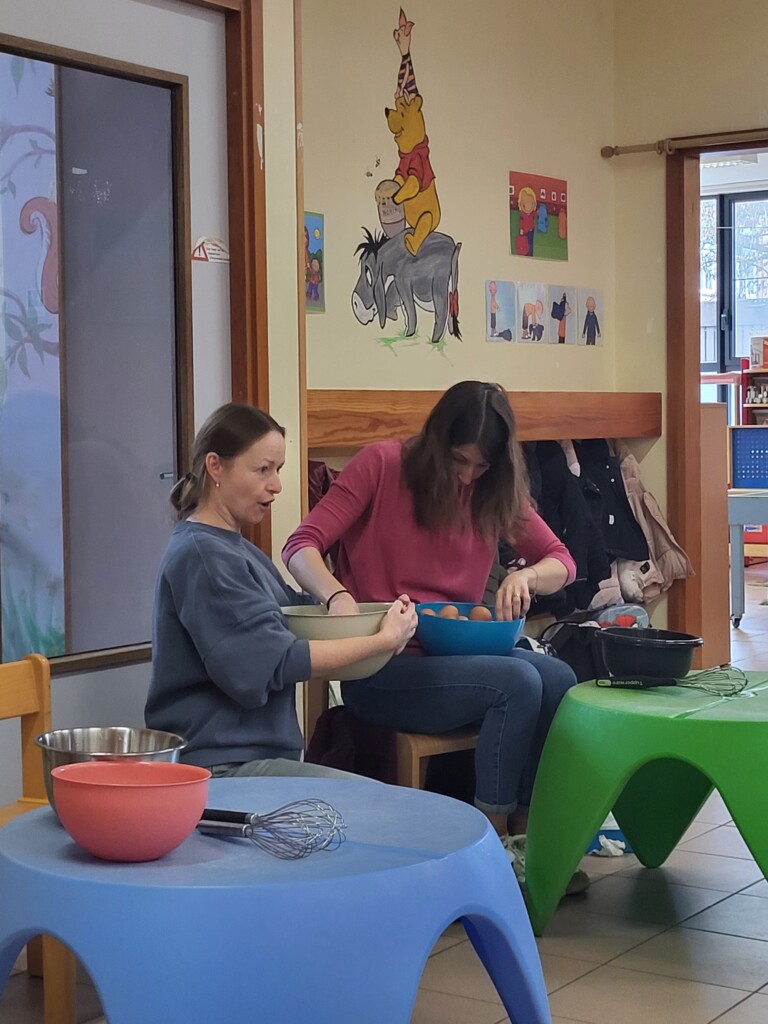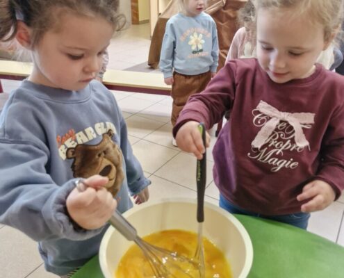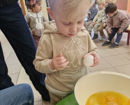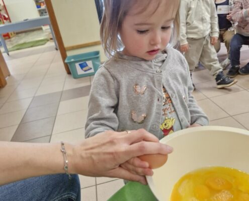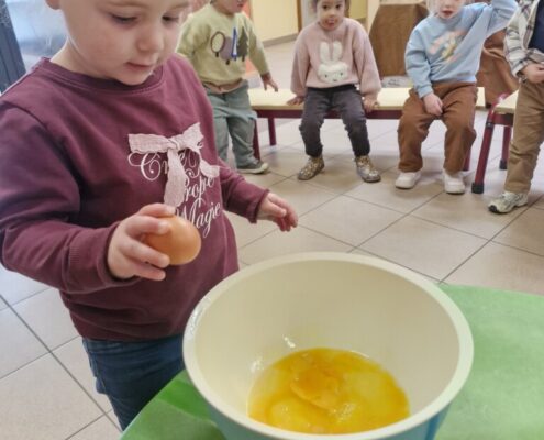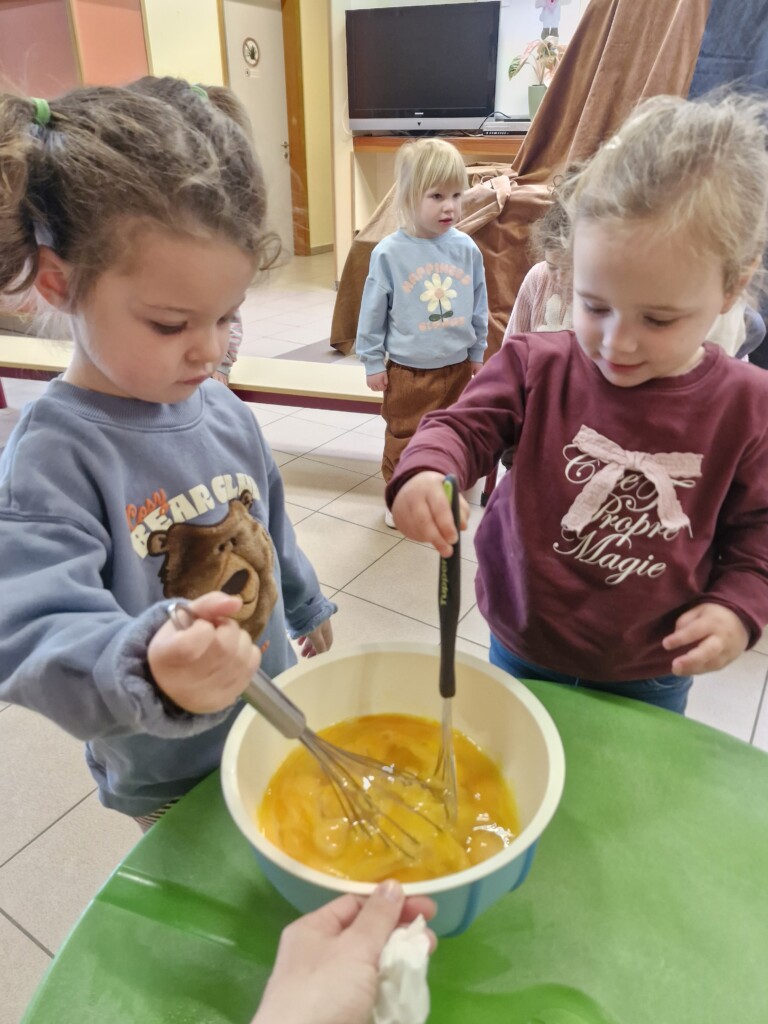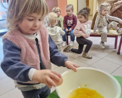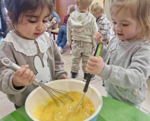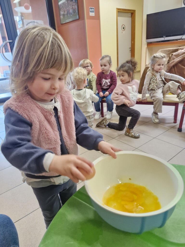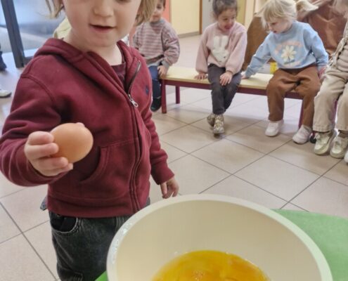 Samen met 1PA maakten we lekkere eitjes klaar. We mochten zelf een eitje breken en dan roeren in de grote pot. De eitjes moesten dan natuurlijk op het vuur en daar moesten we goed opletten, maar de juffen hielpen ons goed. Daarna was het smullen geblazen!