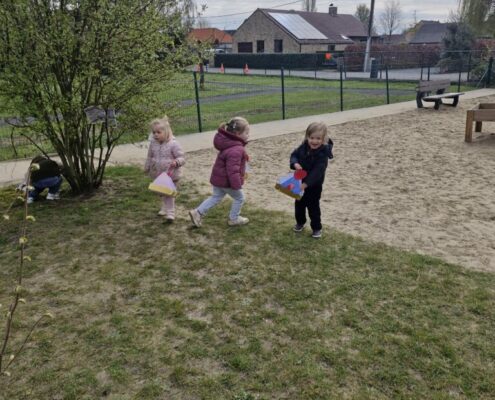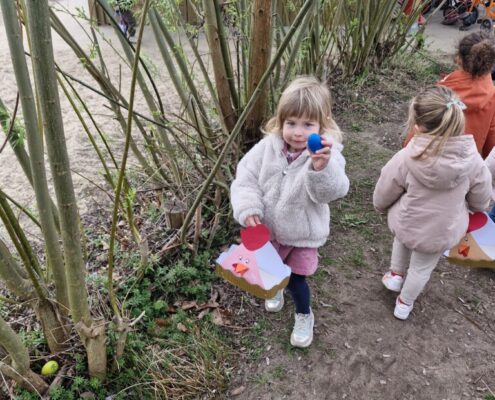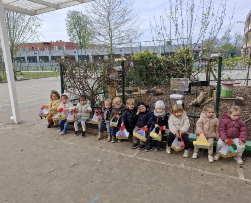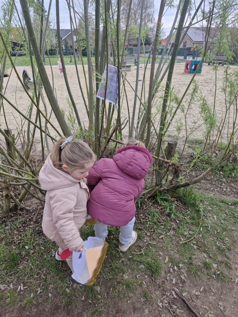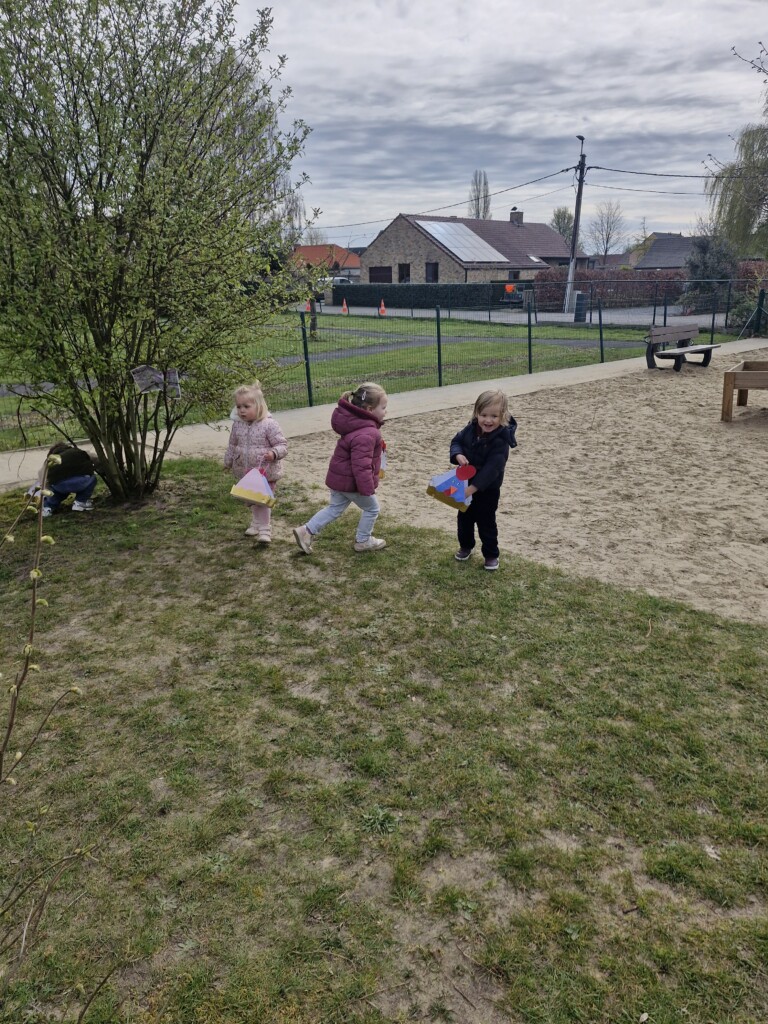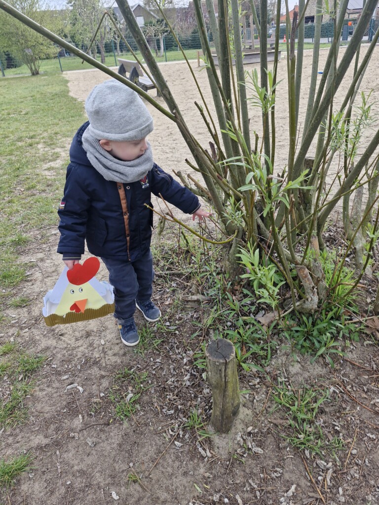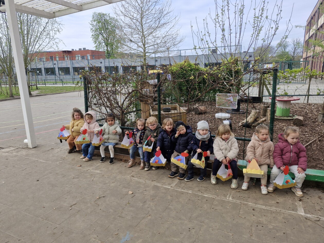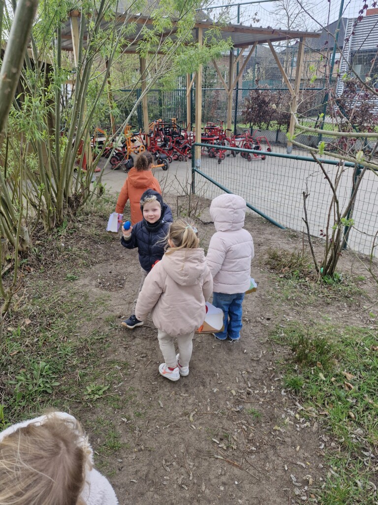 We telden af naar het paasfeest door in onze klas onze paasboom te versieren. We maakten ook een paasmandje waar we hopelijk veel paaseitjes in konden leggen tijdens de paasvakantie. Om al eens te oefenen gingen we buiten op zoek naar paaseitjes (gekleurde schudeitjes). We vonden gelukkig allemaal eentje en daarna konden we in de klas ook al eens proeven van een echt paasei, jammie!