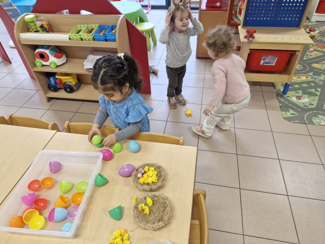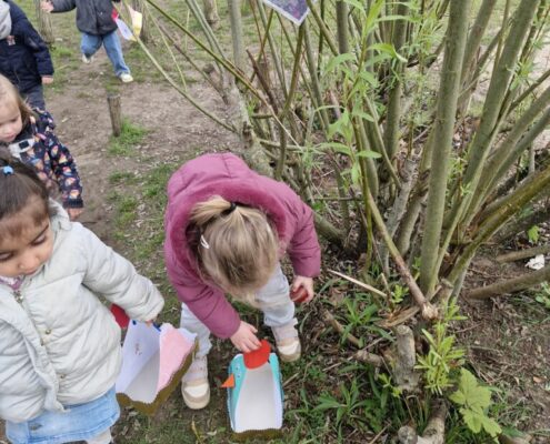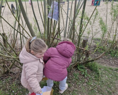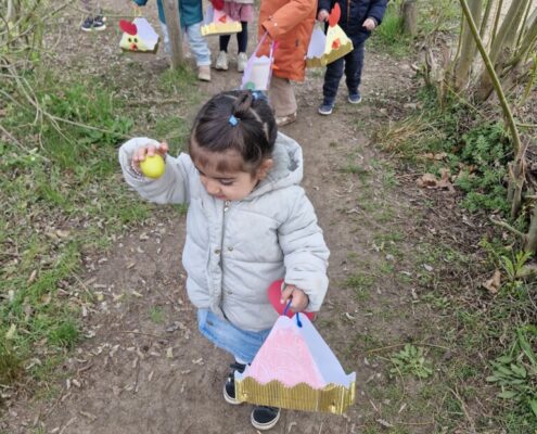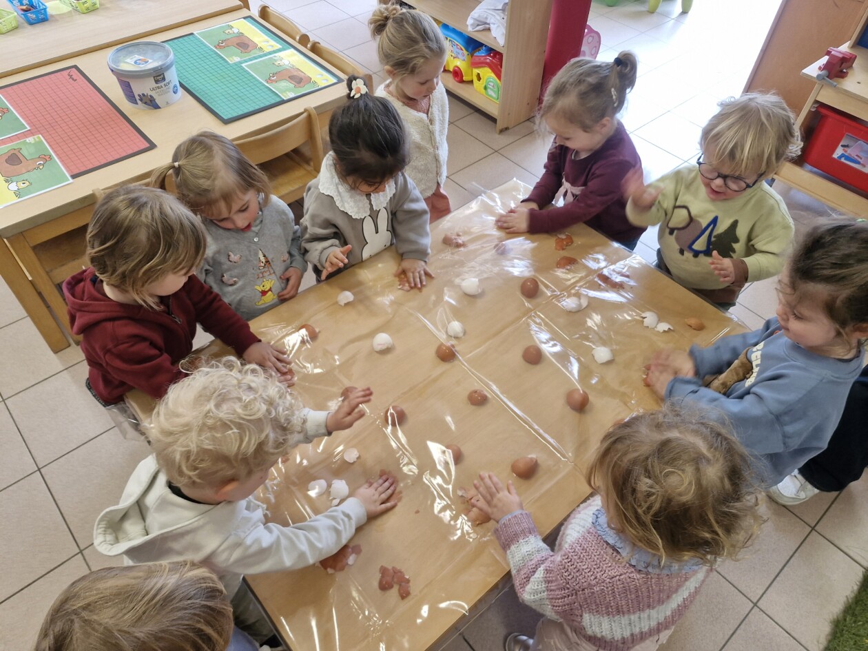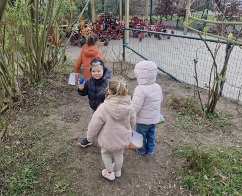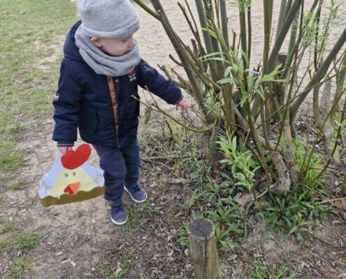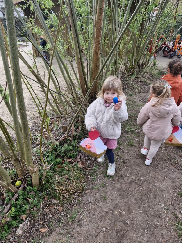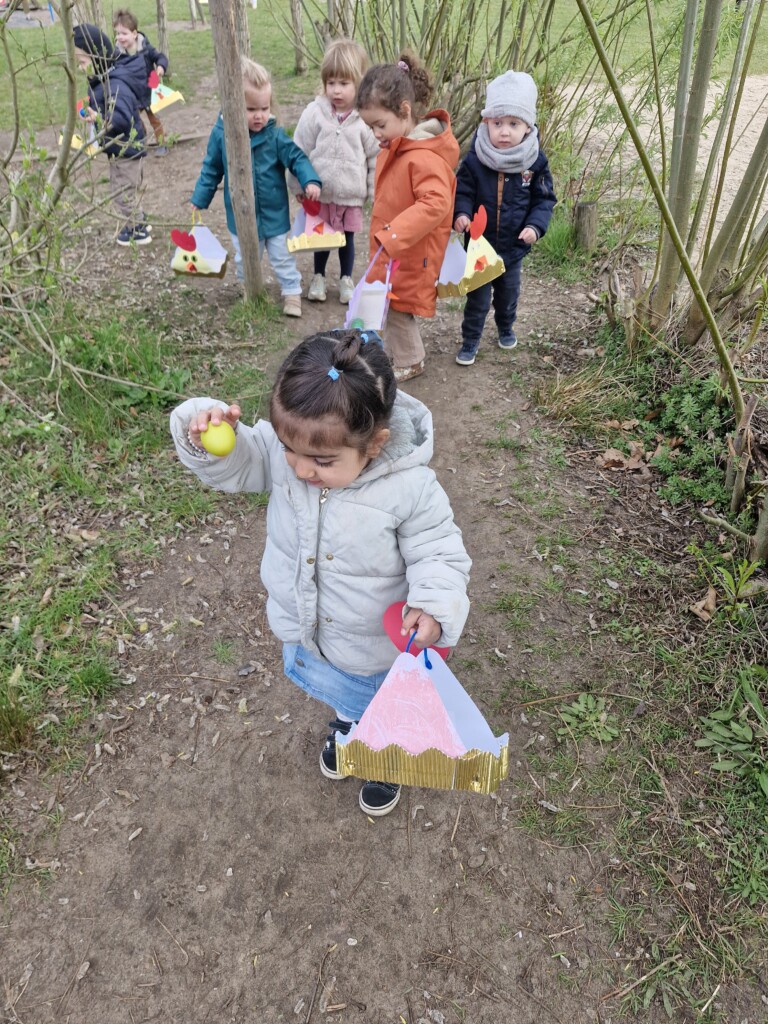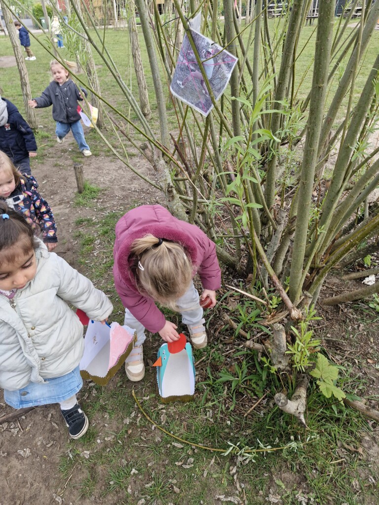 We telden af naar het paasfeest door in onze klas onze paasboom te versieren. We maakten ook een paasmandje waar we hopelijk veel paaseitjes in konden leggen tijdens de paasvakantie. Om al eens te oefenen gingen we buiten op zoek naar paaseitjes (gekleurde schudeitjes). We vonden gelukkig allemaal eentje en daarna konden we in de klas ook al eens proeven van een echt paasei, jammie!