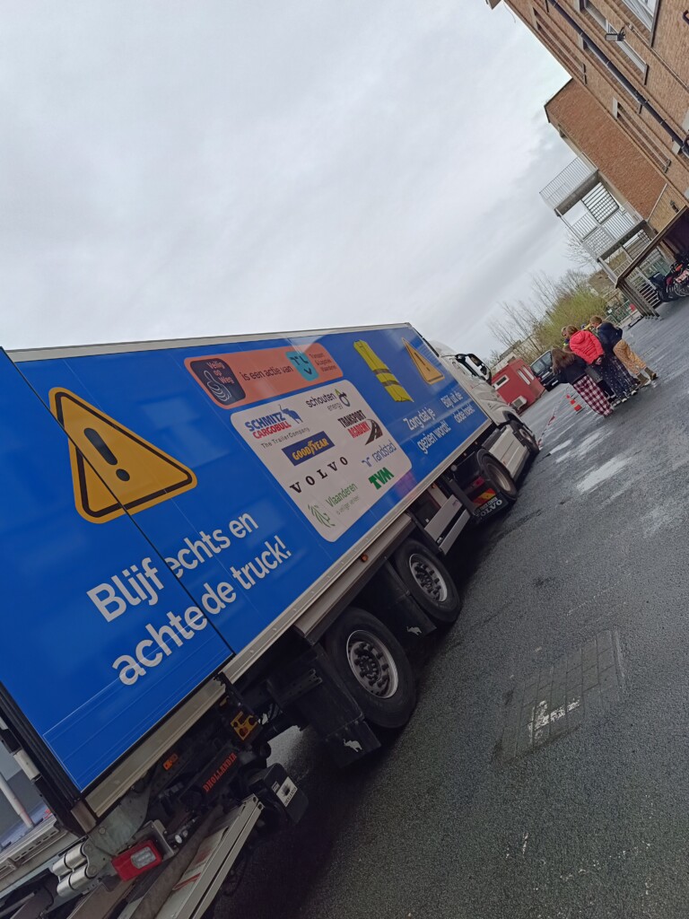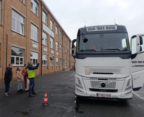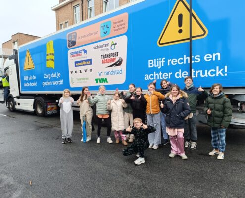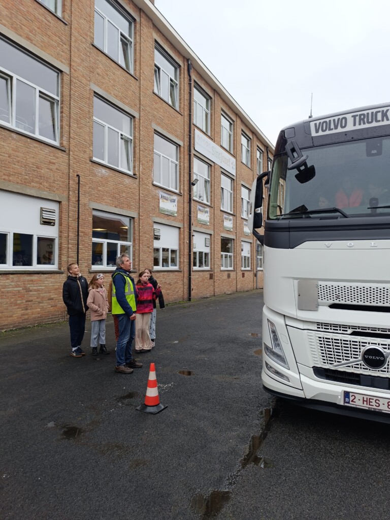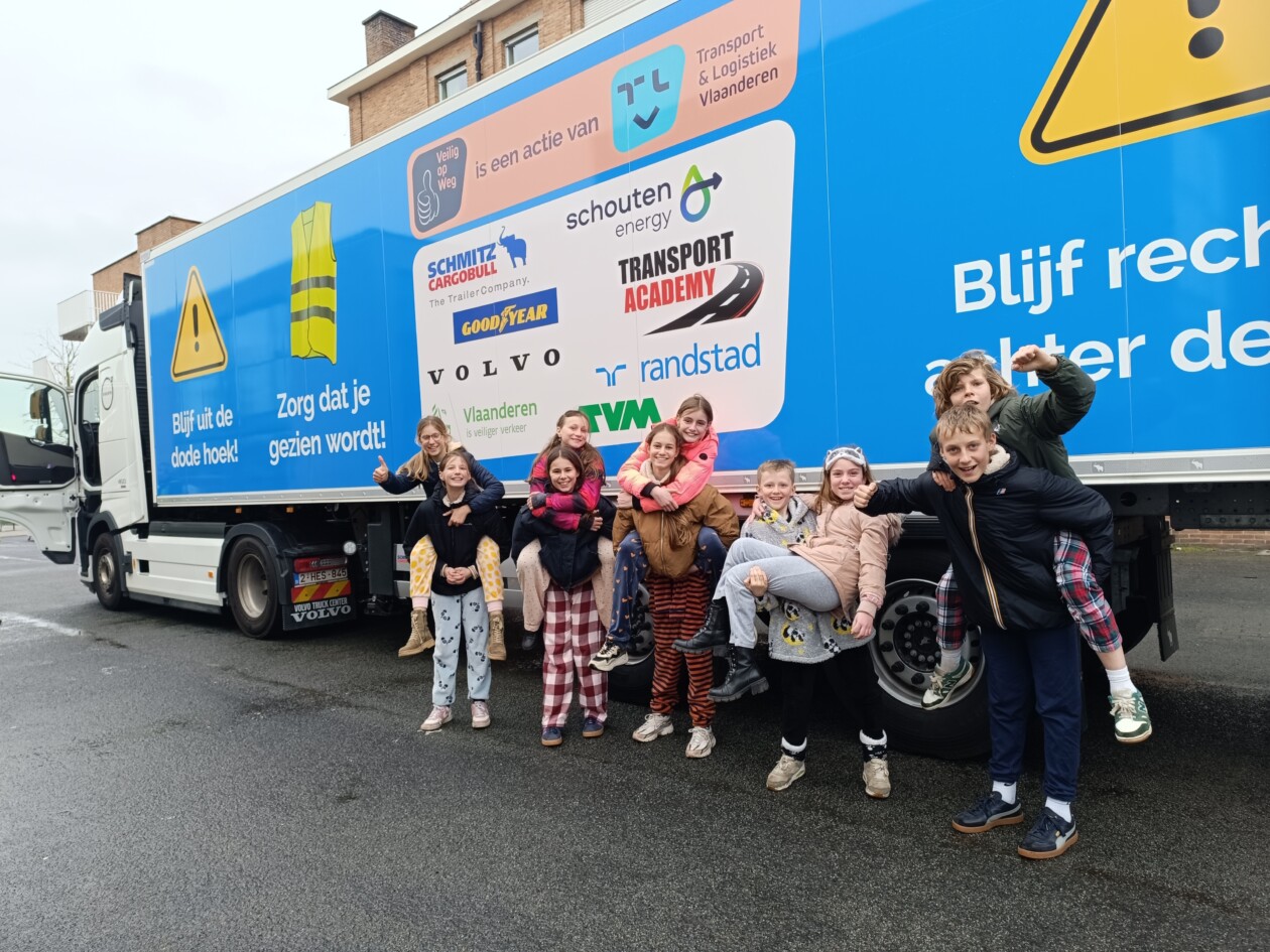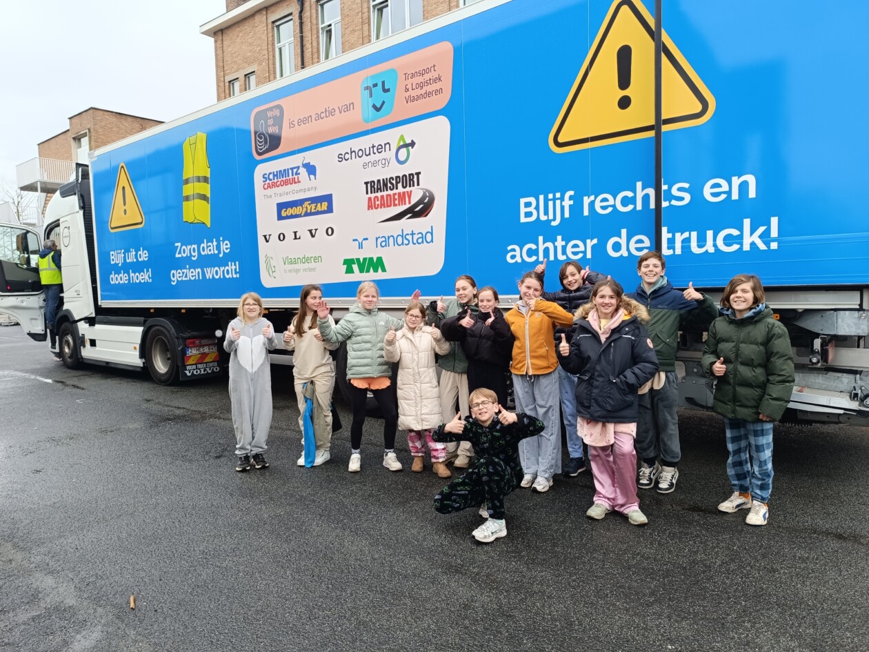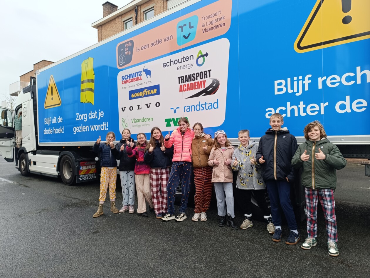 Dodehoekongevallen zijn een blijvend actueel thema en daarom zetten we op onze school actief in op dodehoekeducatie. Een vrijwilliger van “Transport en Logistiek Vlaanderen” kwam in maart naar school met de vrachtwagen voor de sensibiliseringscampagne “Veilig op weg”. We startten met wat theorie waaronder de 4 belangrijkste vuistregels om vervolgens in de praktijk de gevaren van de dode hoek te ondervinden. In maart kwamen we ook in pyjama naar school. We willen op die manier steun bieden aan zieke kinderen en jongeren die tijdelijk of langdurig niet fysiek naar school kunnen. Tijdens de wiskundeles ervaarden we nog eens concreet de kijklijnen in de klas. Wie uit de klas is wel zichtbaar en wie is niet zichtbaar vanuit een bepaalde positie? Hoe kan ik mijn gezichtsveld verbreden of versmallen? Wij herhaalden de theorie en beleefden het in praktijk.
